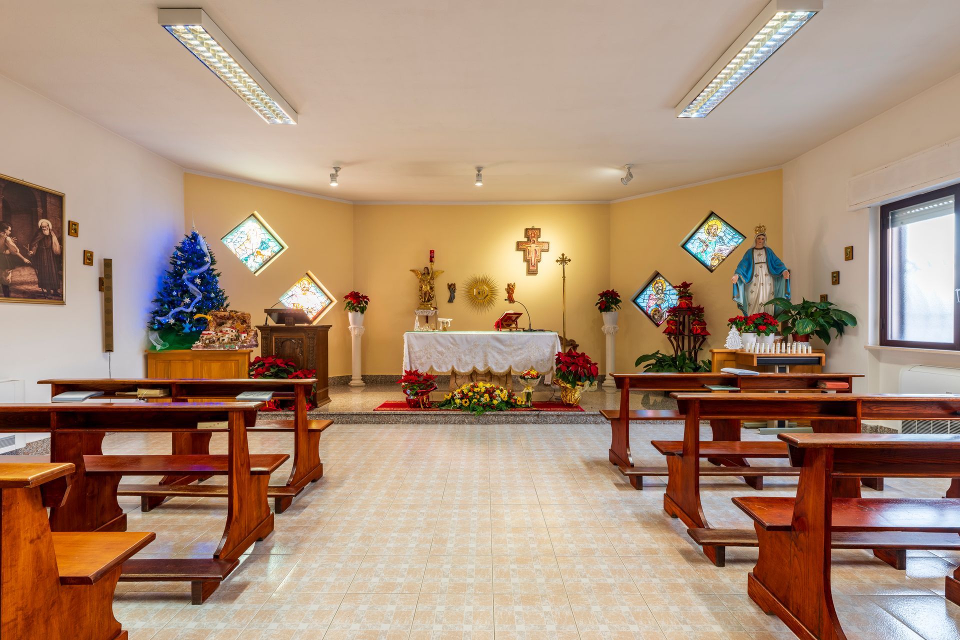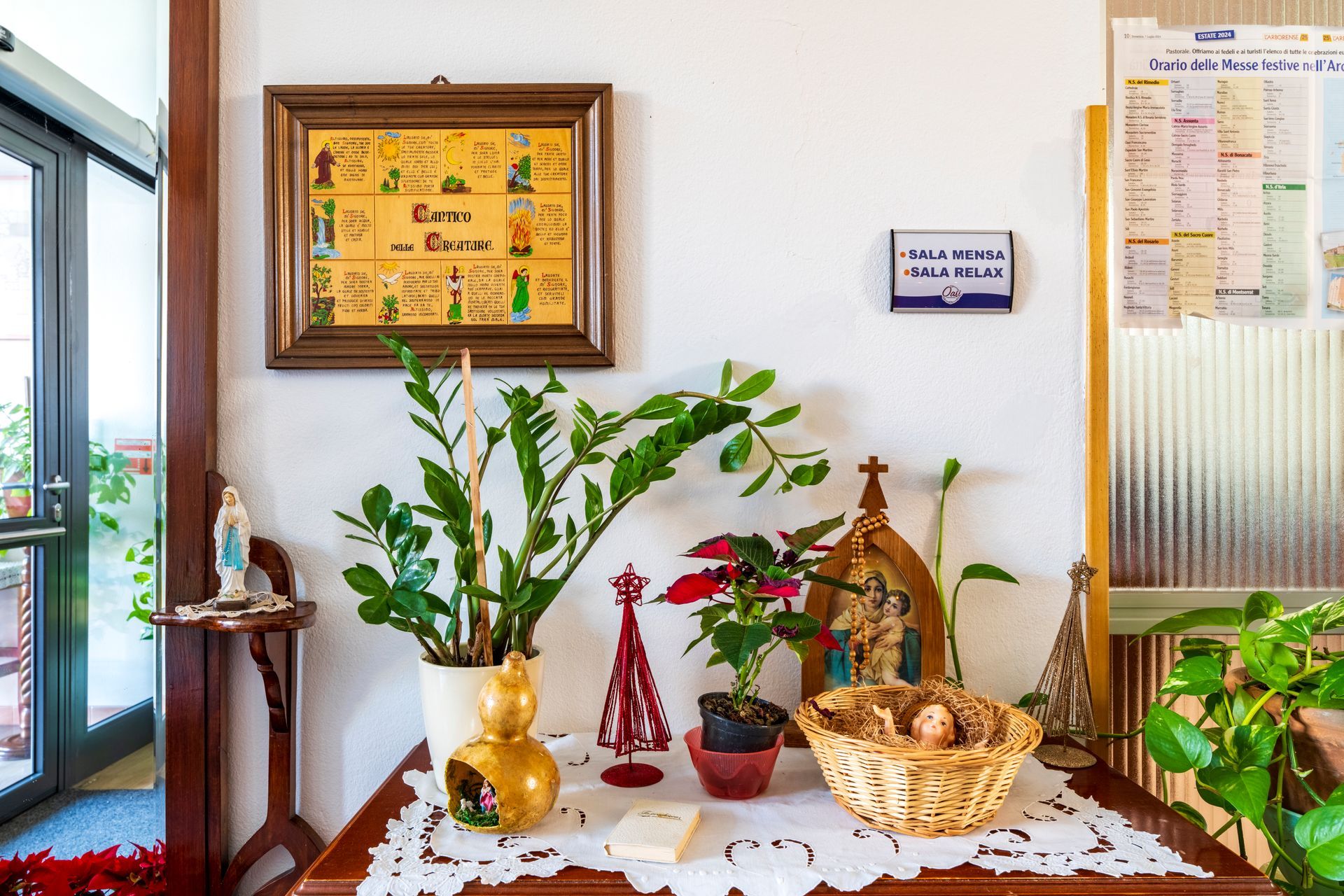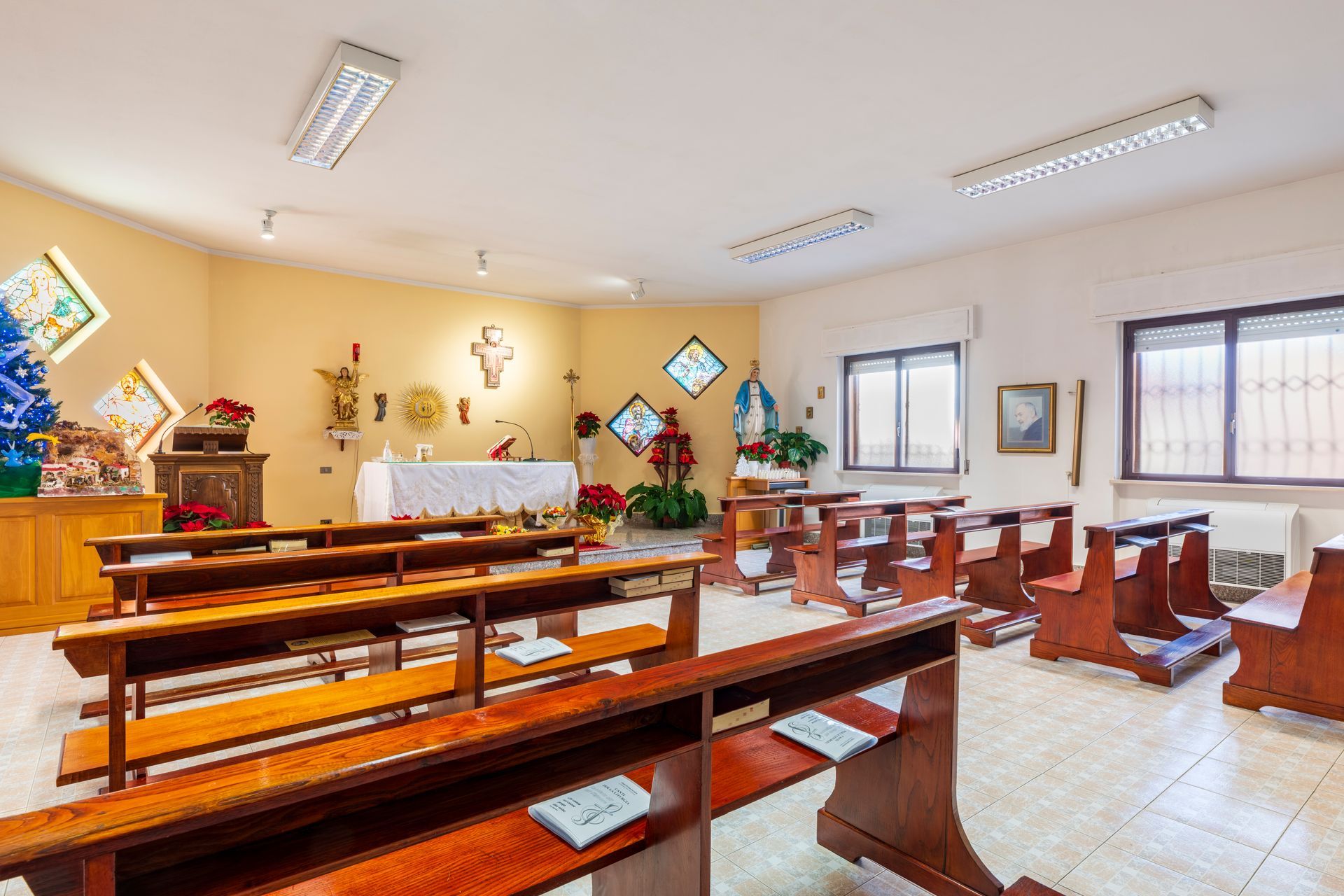 Nel piano terra c’è la zona mensa in cui sono presenti la sala comunitaria per la consumazione dei pasti, la cucina in cui sono direttamente preparati i pasti per le ospiti, le dispense e una stanza, collegata con l’esterno, che è adibita a lavanderia e stireria. Sempre nel piano terra c’è una sala soggiorno con spazio TV, interamente climatizzata, in cui le ospiti trascorrono gran parte del loro tempo comunitario e possono ricevere le visite di parenti e ospiti. Ancora, nel piano terra è presente una cappella in cui si svolgono quotidiane funzioni religiose cattoliche legate alla spiritualità francescana. Infine, nel piano terra sono presenti l’ufficio della direzione, un ambulatorio e una infermeria dotate di tutte le attrezzature necessarie per le visite mediche e le prestazioni sanitarie e infermieristiche.
