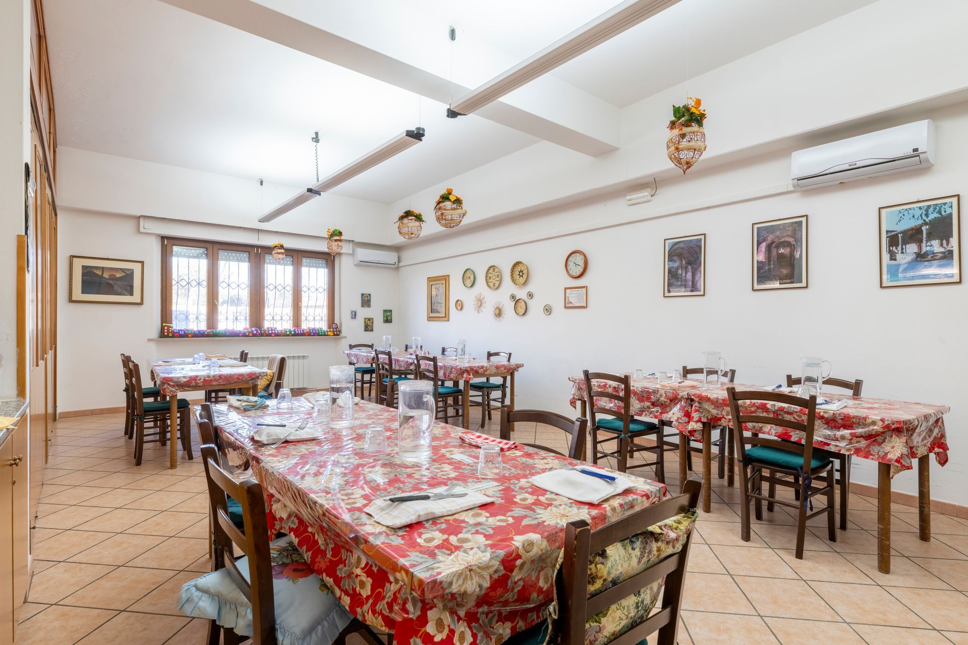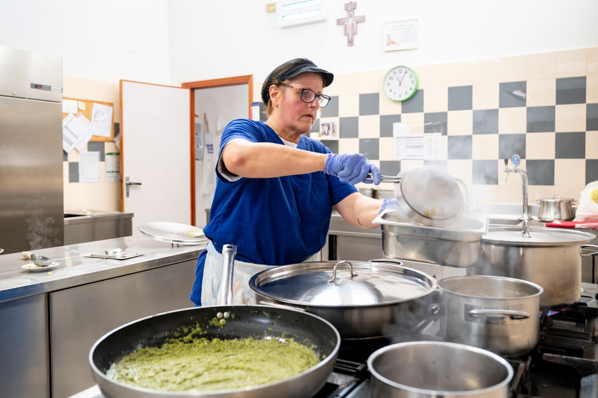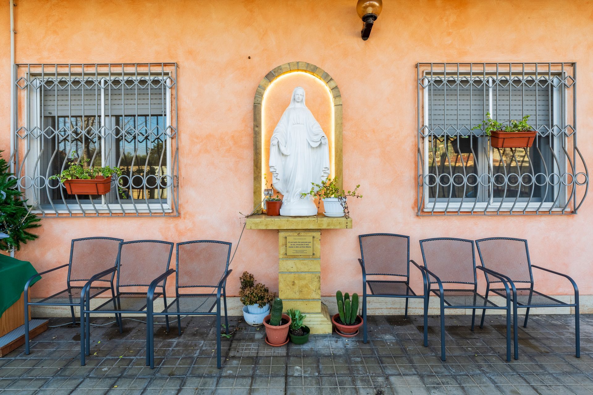 Nel piano terra c’è la zona mensa in cui sono presenti la sala comunitaria per la consumazione dei pasti, la cucina in cui sono direttamente preparati i pasti per le ospiti, le dispense e una stanza, collegata con l’esterno, che è adibita a lavanderia e stireria. Sempre nel piano terra c’è una sala soggiorno con spazio TV, interamente climatizzata, in cui le ospiti trascorrono gran parte del loro tempo comunitario e possono ricevere le visite di parenti e ospiti. Ancora, nel piano terra è presente una cappella in cui si svolgono quotidiane funzioni religiose cattoliche legate alla spiritualità francescana. Infine, nel piano terra sono presenti l’ufficio della direzione, un ambulatorio e una infermeria dotate di tutte le attrezzature necessarie per le visite mediche e le prestazioni sanitarie e infermieristiche.